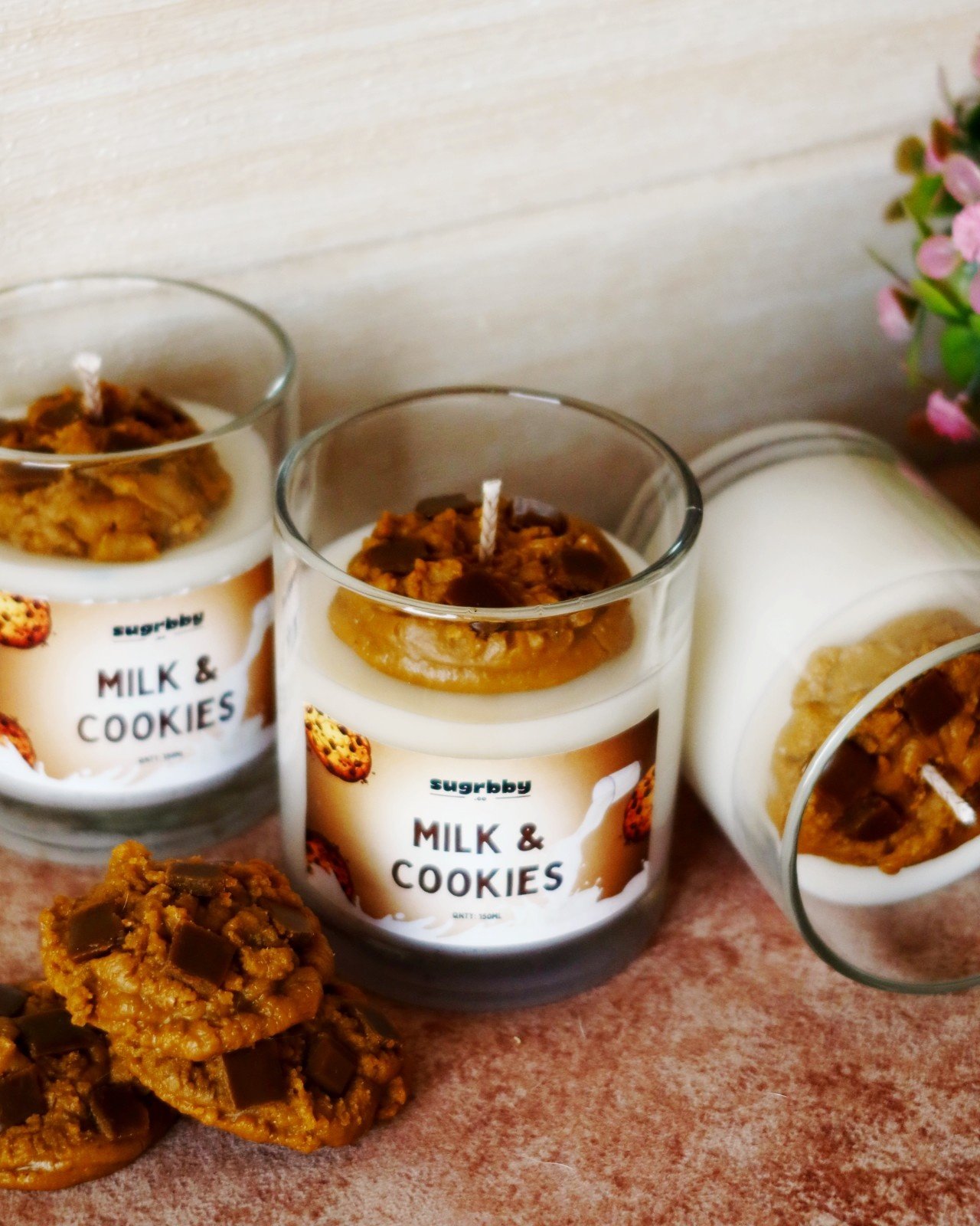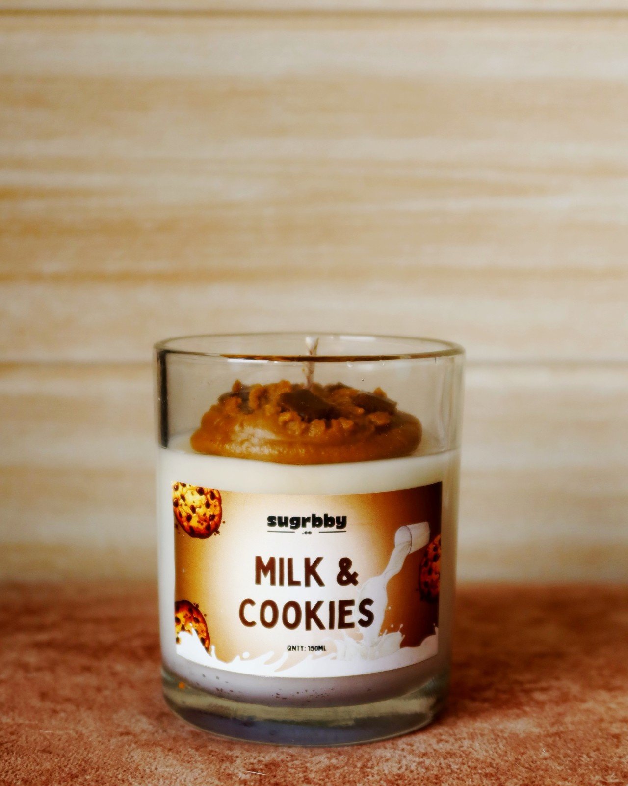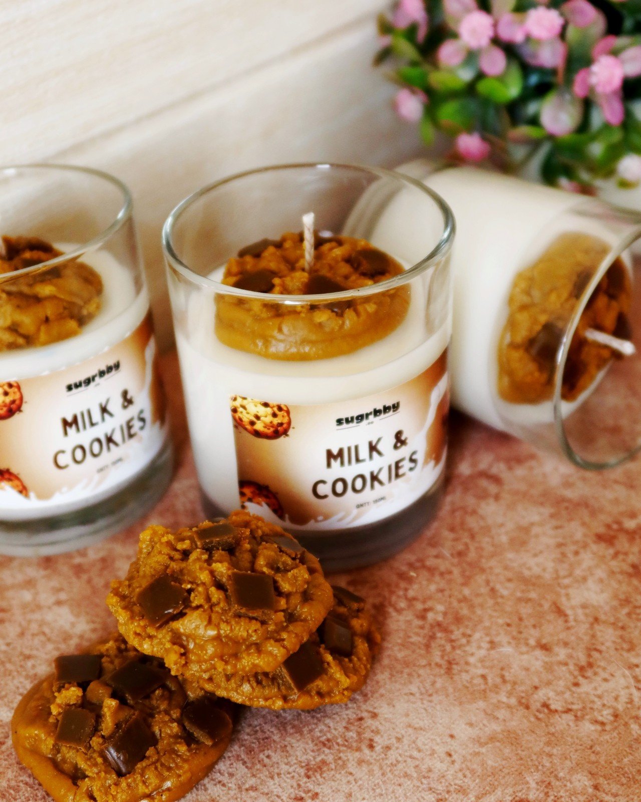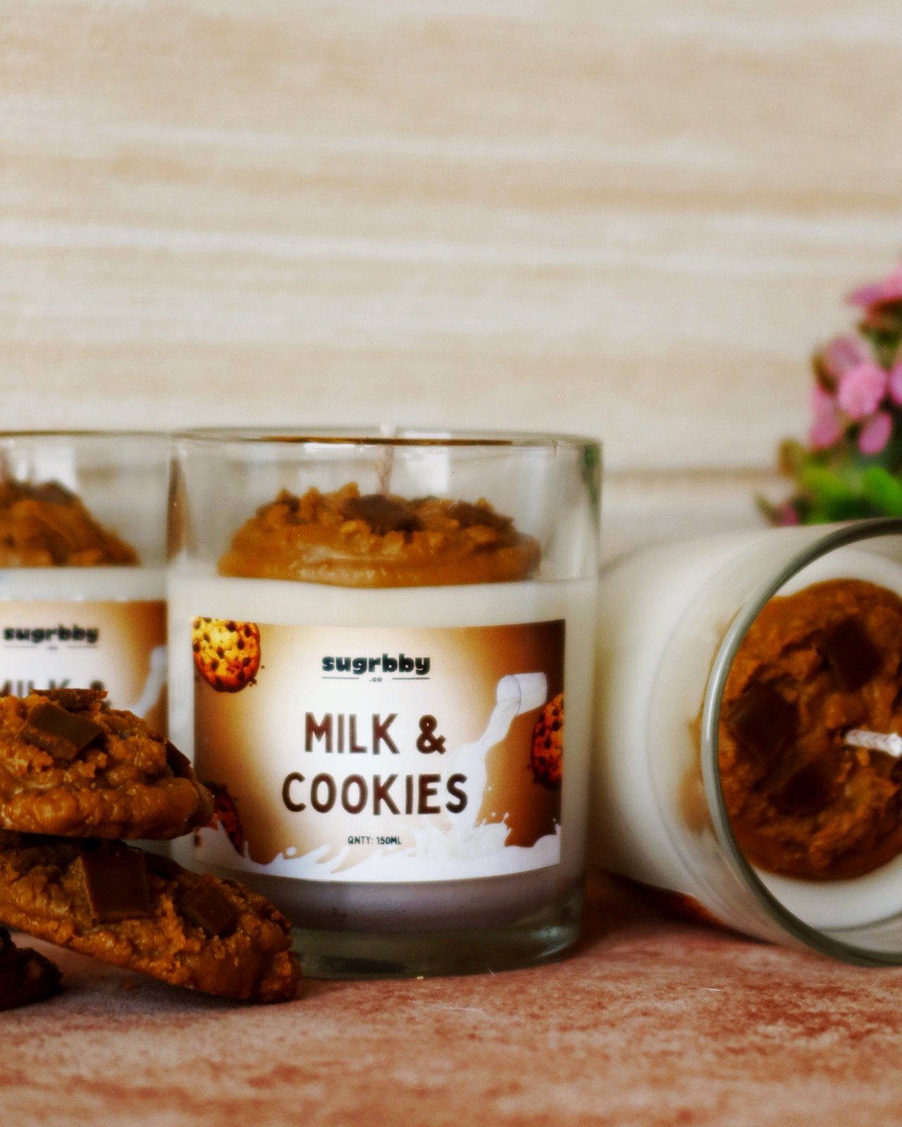 A candle that looks and smells like a cozy glass of milk served with freshly baked chocolate cookies. With hand-poured wax cookies placed beside a creamy milk-like wax base, this candle captures the comforting, nostalgic feeling of late-night snacks and warm kitchens.